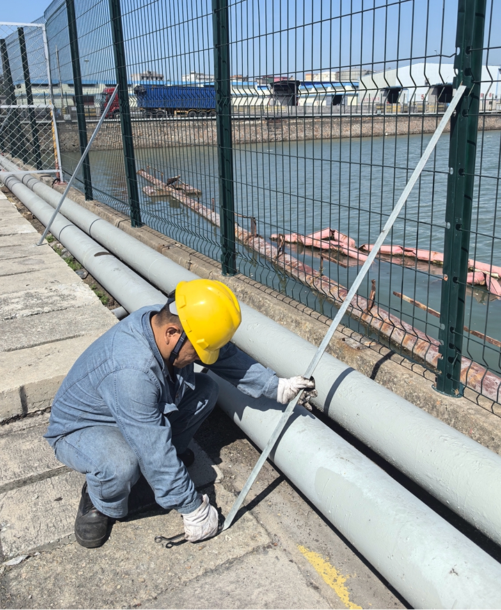 碼頭之間周界圍擋是安全管控的重要屏障,也是港口設(shè)施保安工作重要設(shè)施之一。按外委維修方案,需整體制作圍擋,費(fèi)用約8萬元。 “能不能自己干?!”黨員維修組現(xiàn)場測量圍擋尺寸,設(shè)計(jì)“鋼管立柱+鋼絲網(wǎng)格+防撞條”的簡易圍擋方案,反復(fù)論證可行性后,決定擼起袖子自己干!為確保穩(wěn)固性,黨員維修組用水平儀一米一米測標(biāo)高,用扳手一顆一顆緊螺栓;為防臺(tái)風(fēng)天氣傾倒,把鋼管底部焊接在混凝土基座,用水平尺校準(zhǔn)“毫米級(jí)”垂直度。5天的連續(xù)作業(yè),為港口經(jīng)營公司周界圍擋起整齊牢固的“安全防線”。